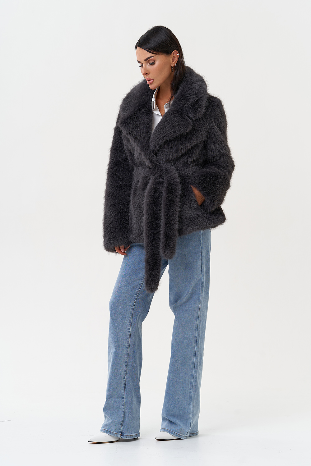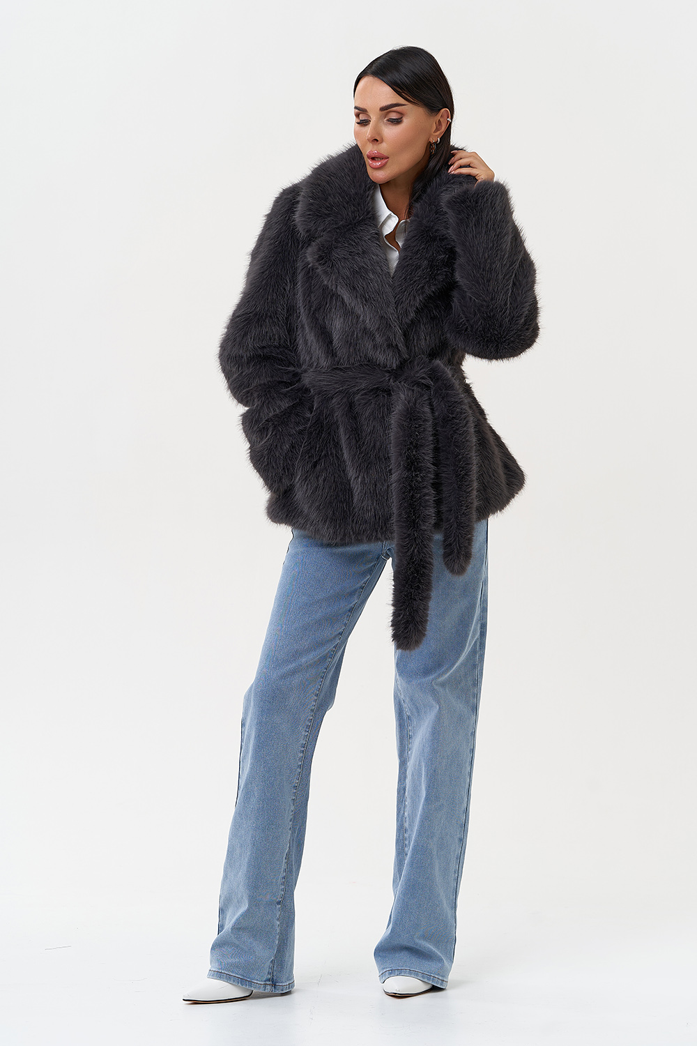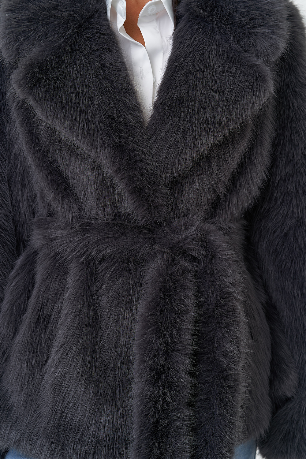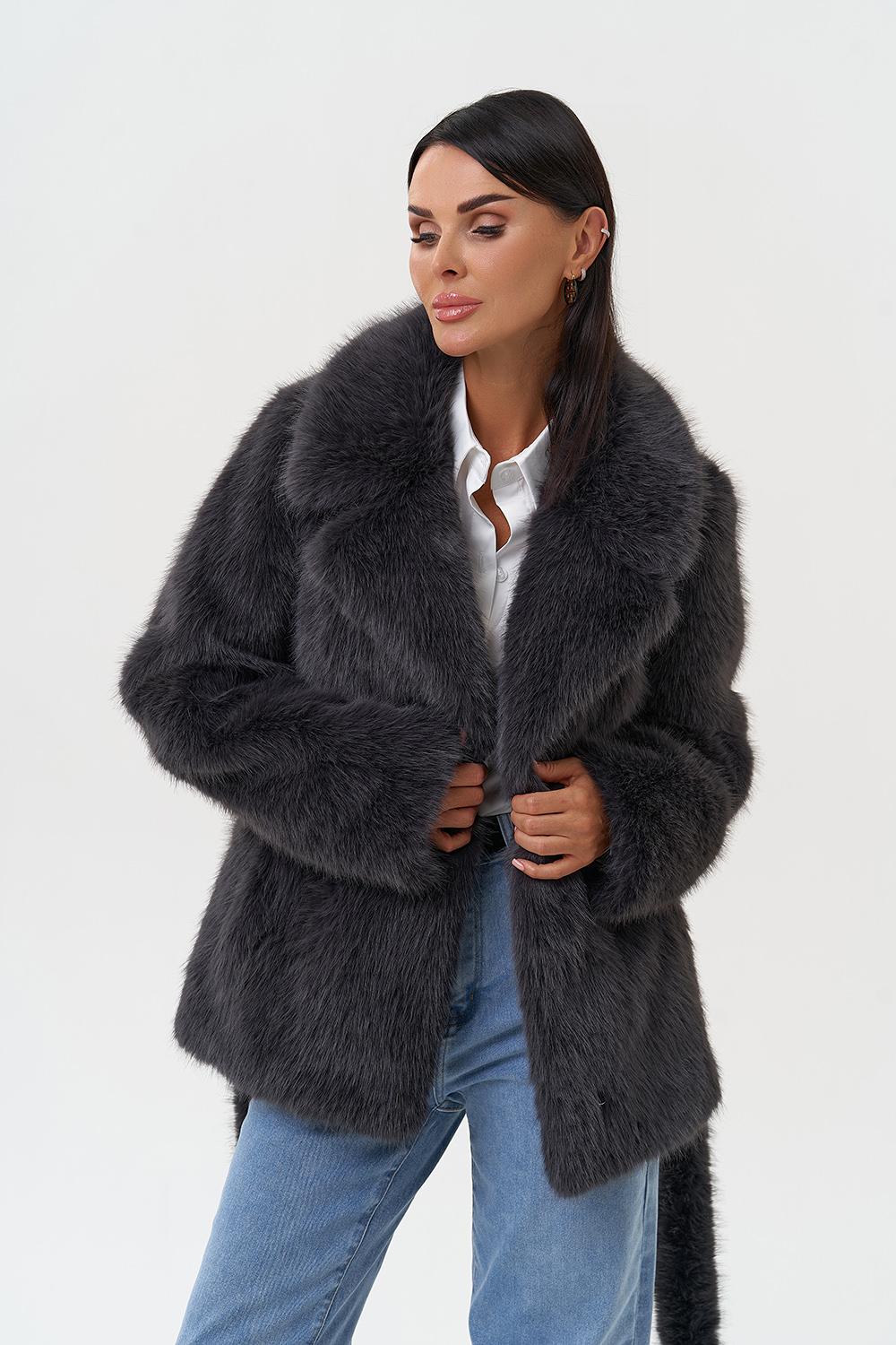 Фасон - прямой Длина изделия - 65 см Цвет - темно-серый Материал - экомех под песца Состав полотна - полиэстер 100% Подкладка - полиэстер 100% Вид застежки -крючки, пояс Вид ворота - английский воротник Фасон рукава - втачной, длинный |