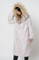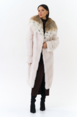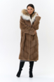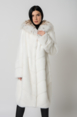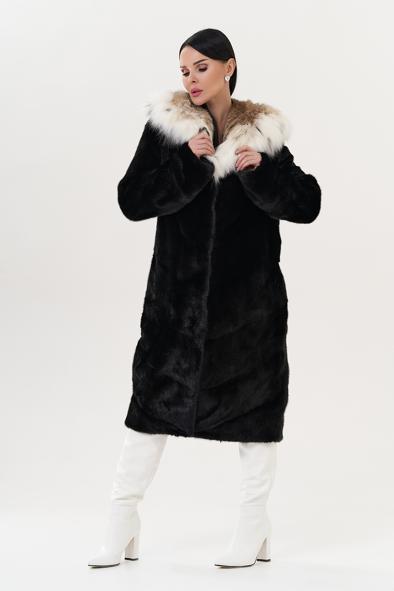 Модель украшает капюшон с отделкой из меха рыси. Мех норки черного цвета