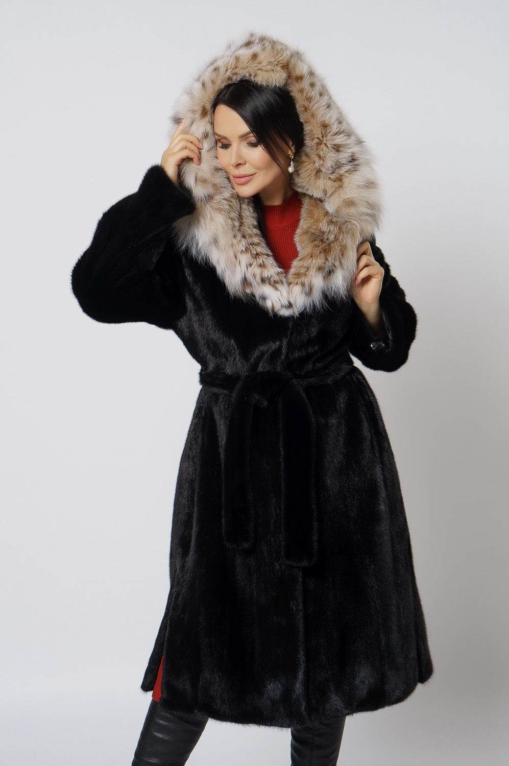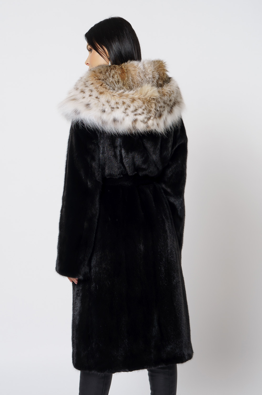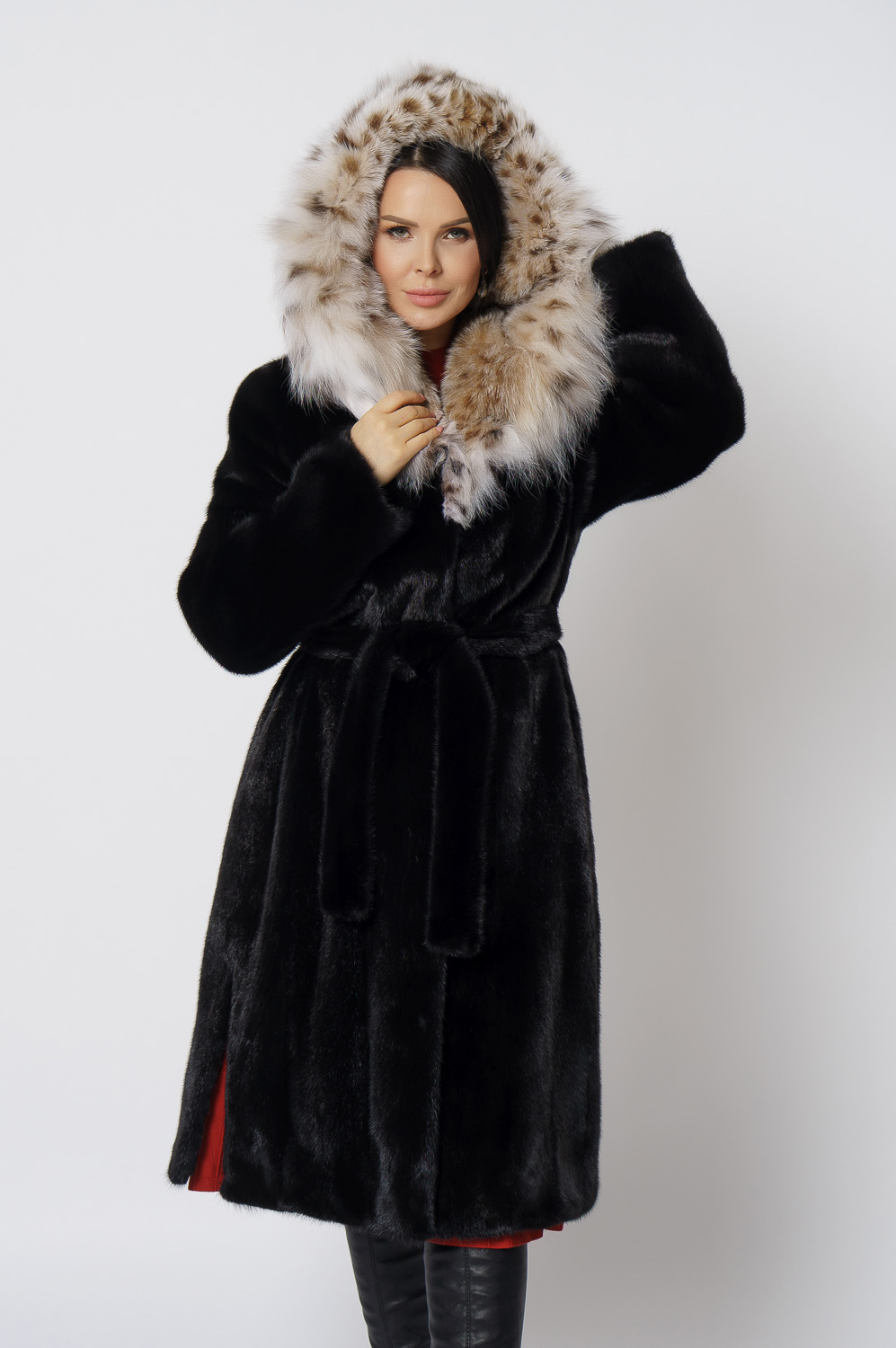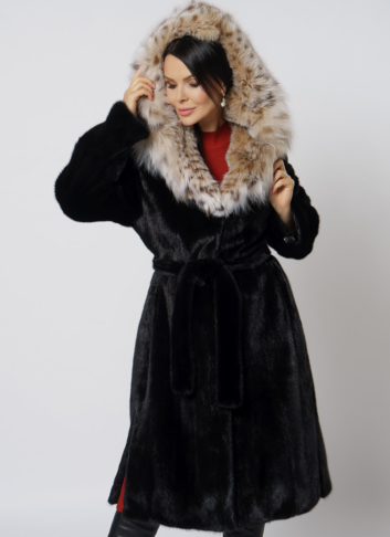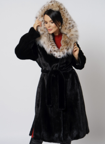 Норковая шуба с капюшоном с отделкой из рыси