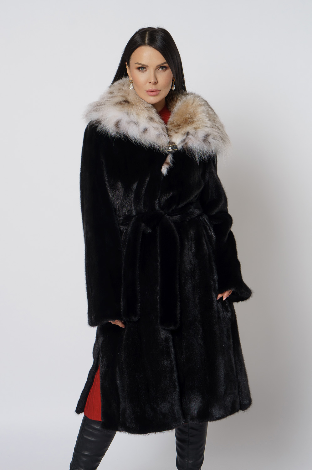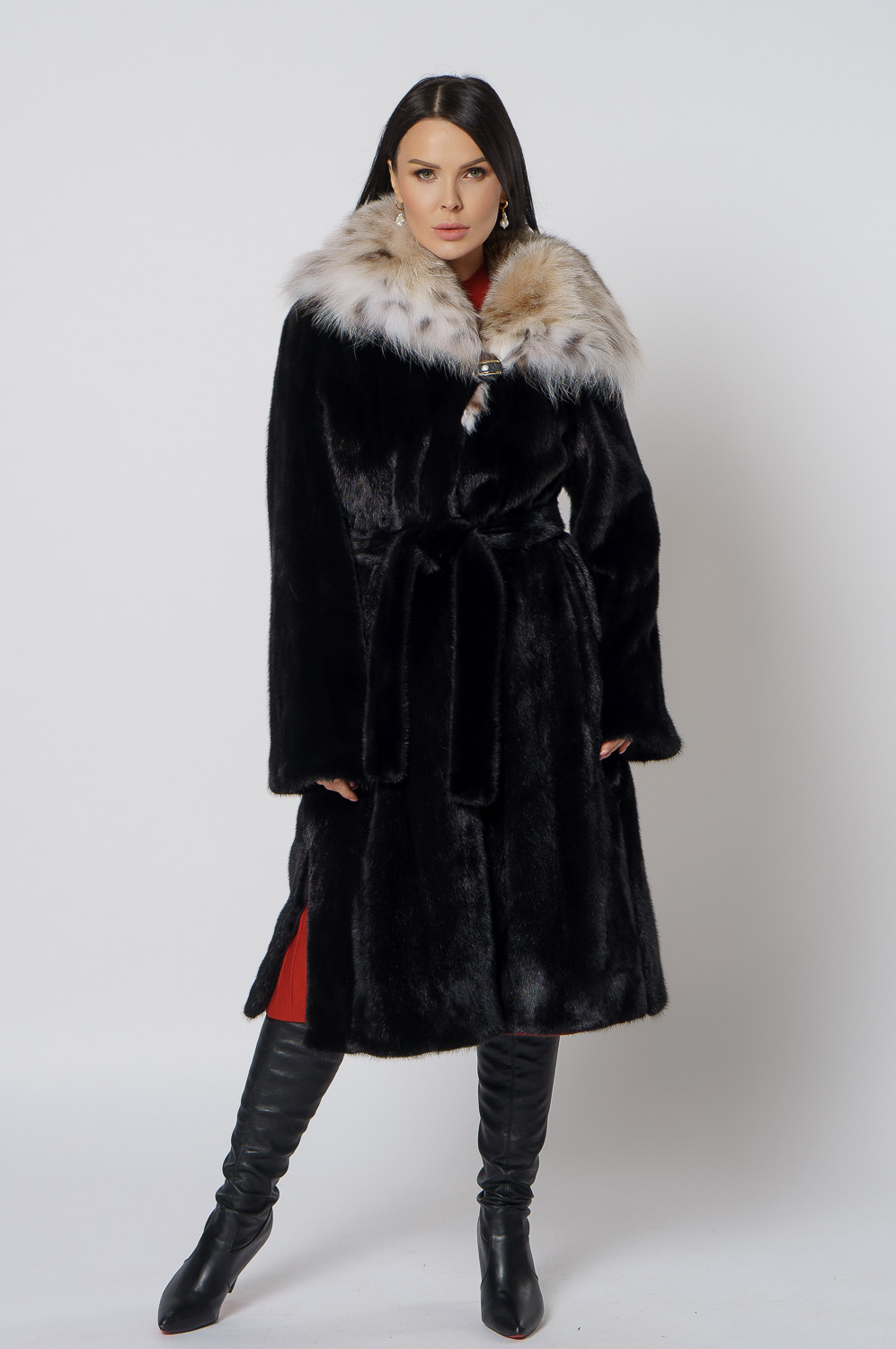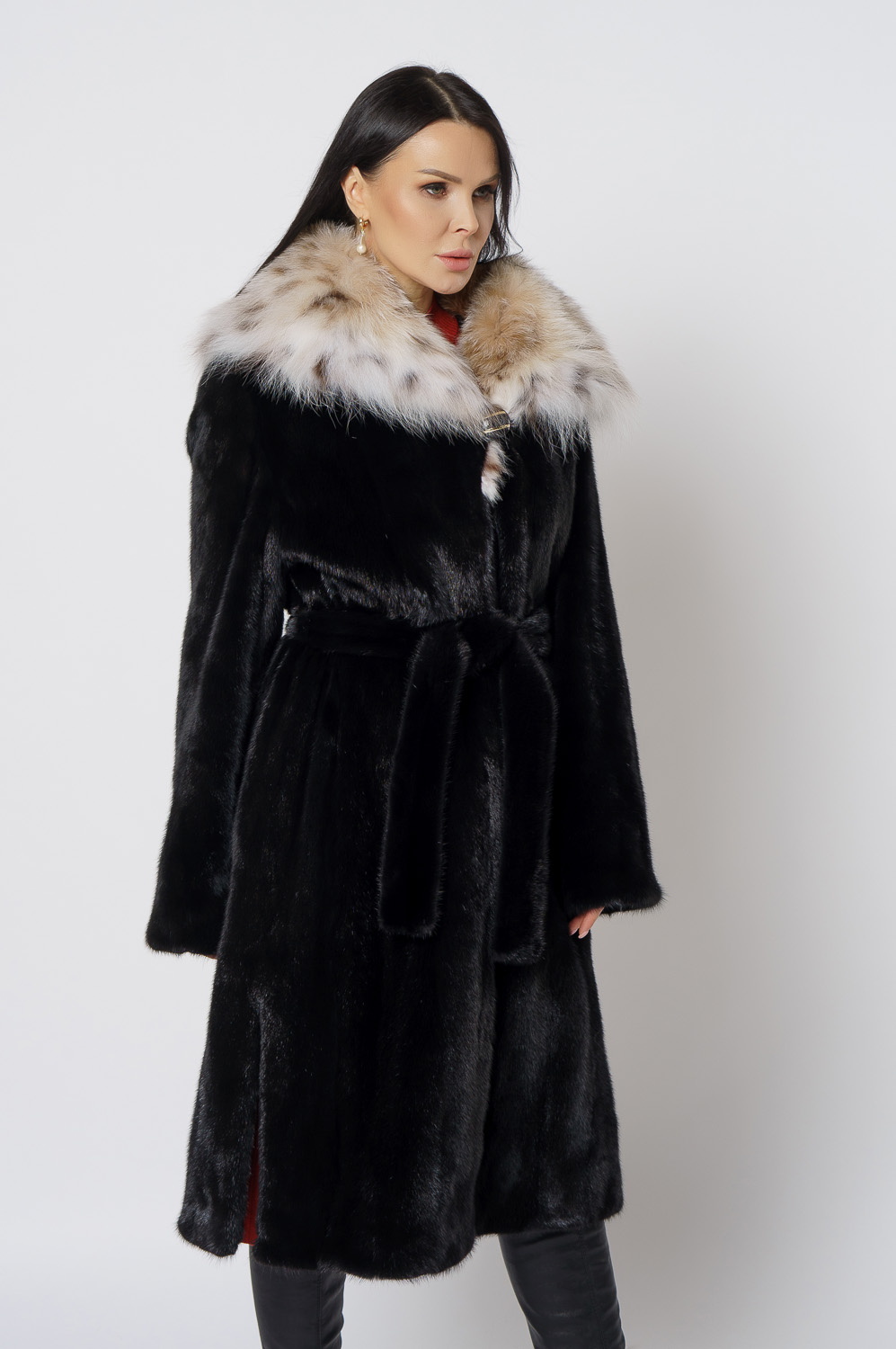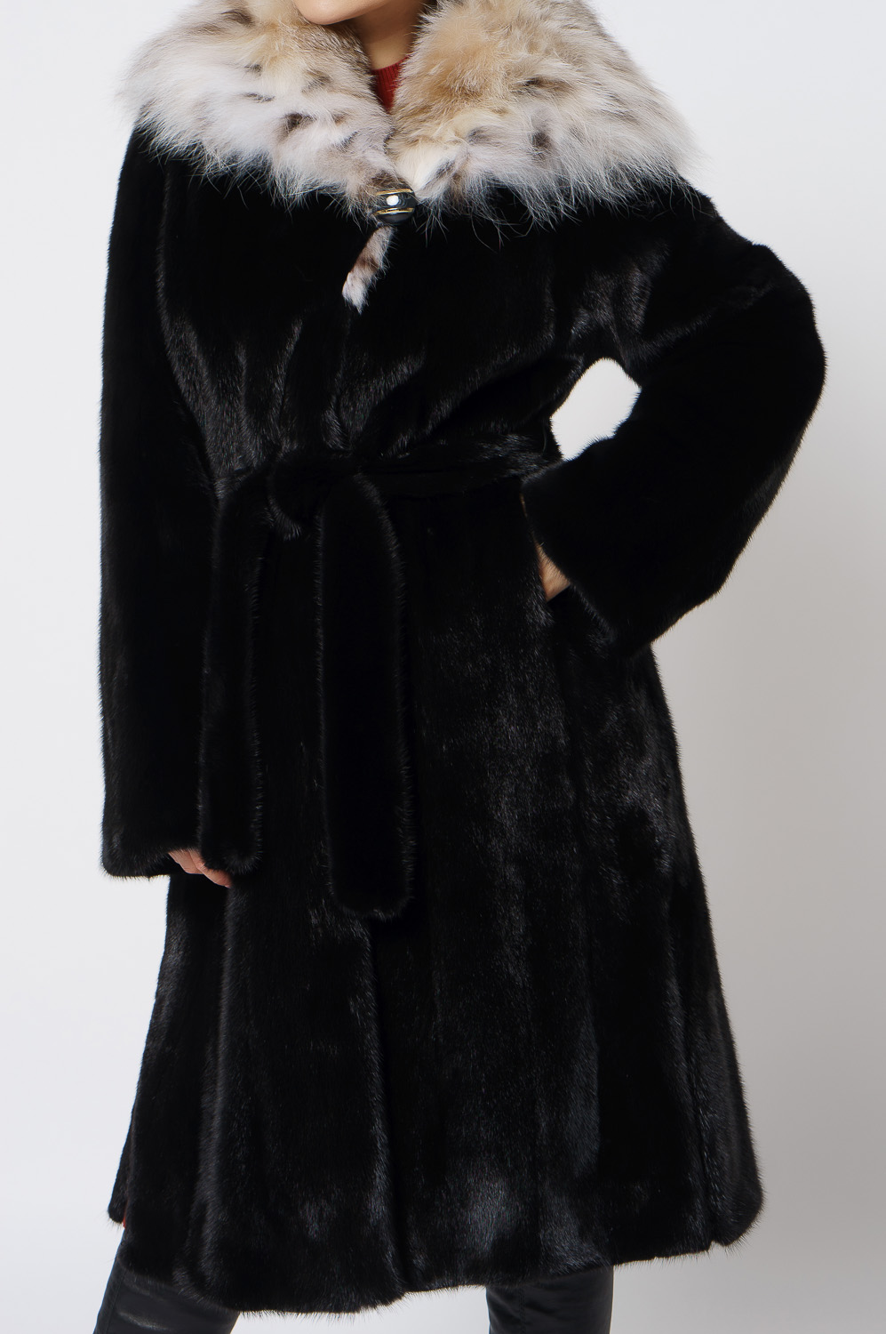 Норковая шуба с капюшоном с отделкой из рыси